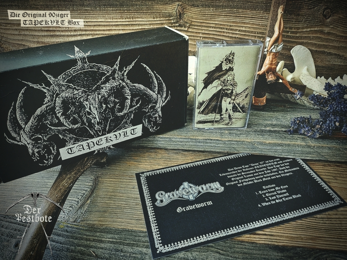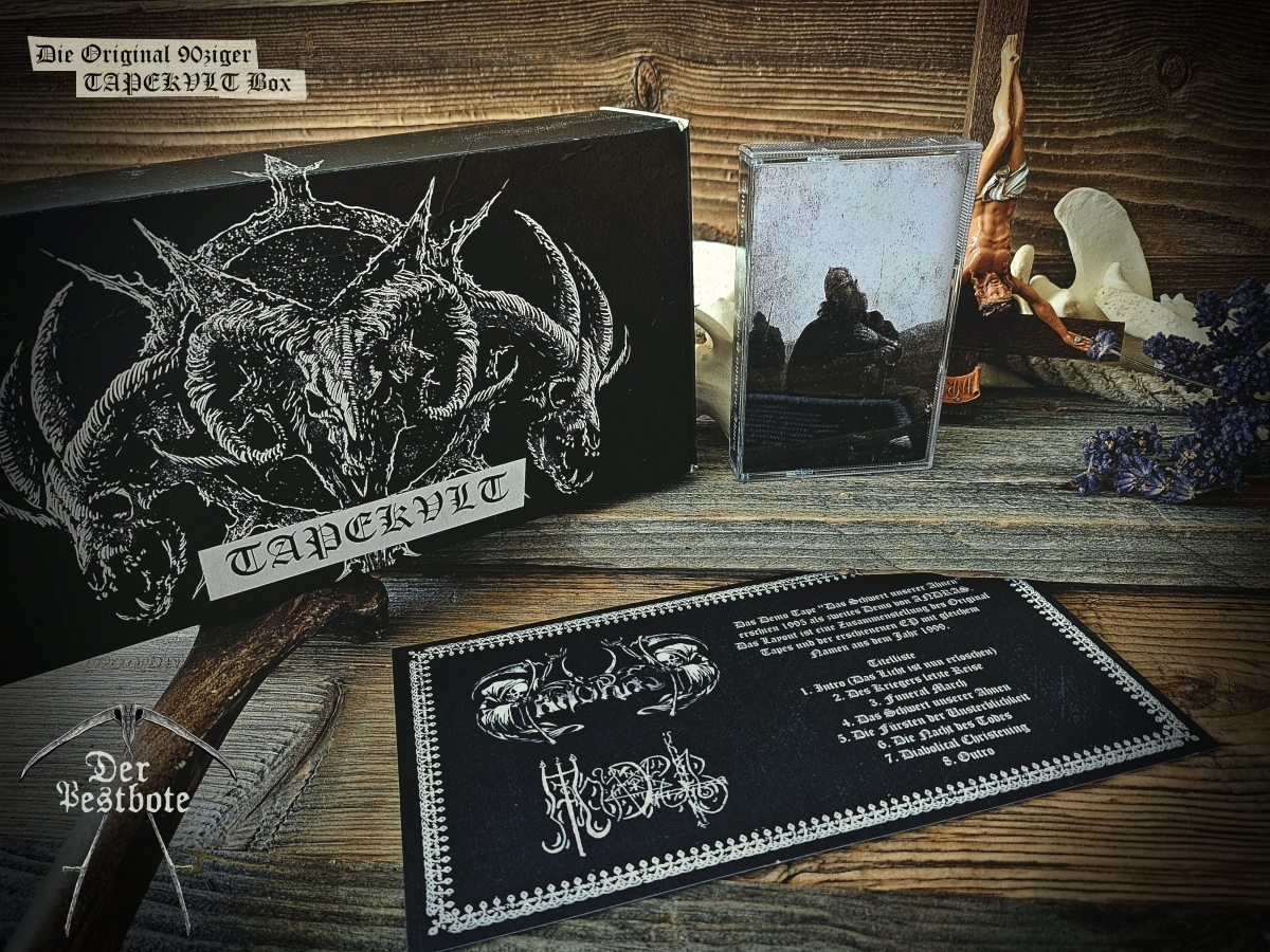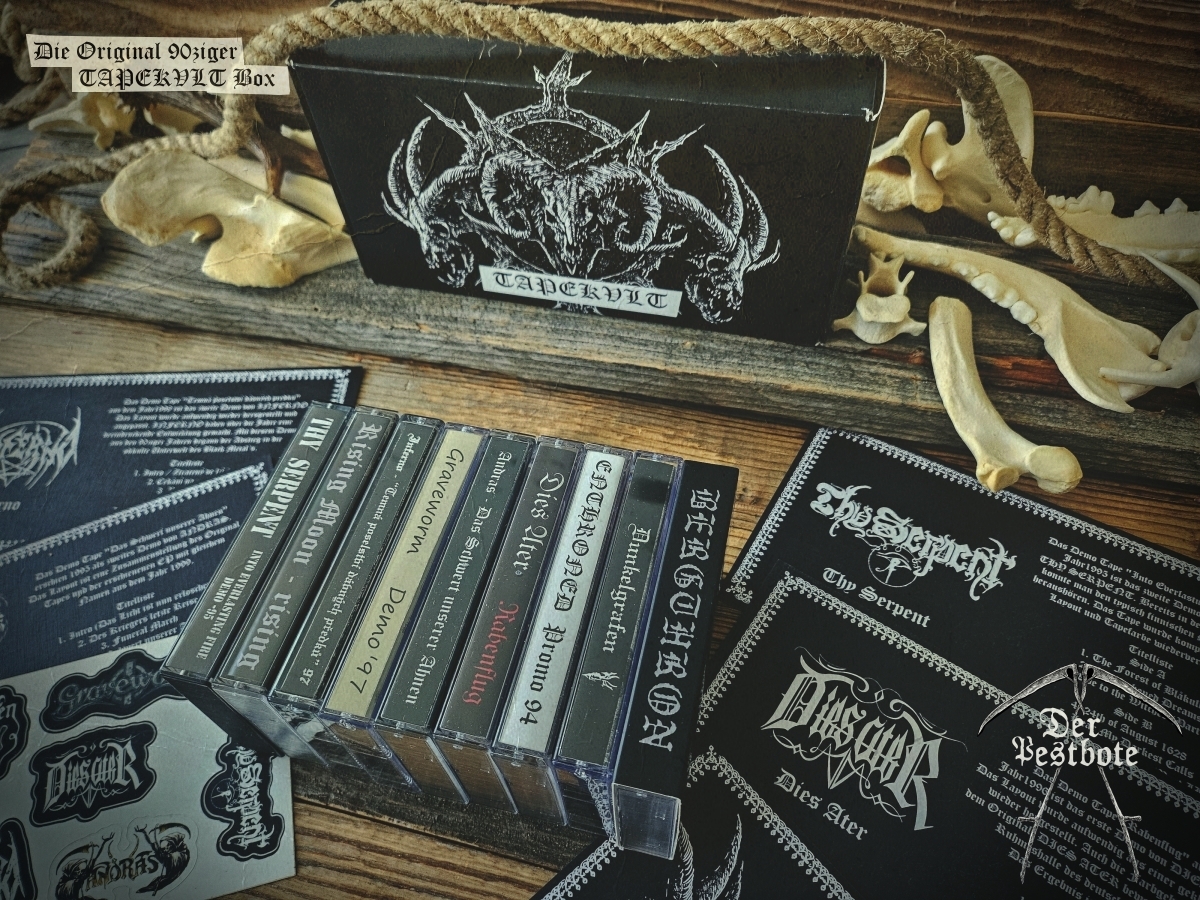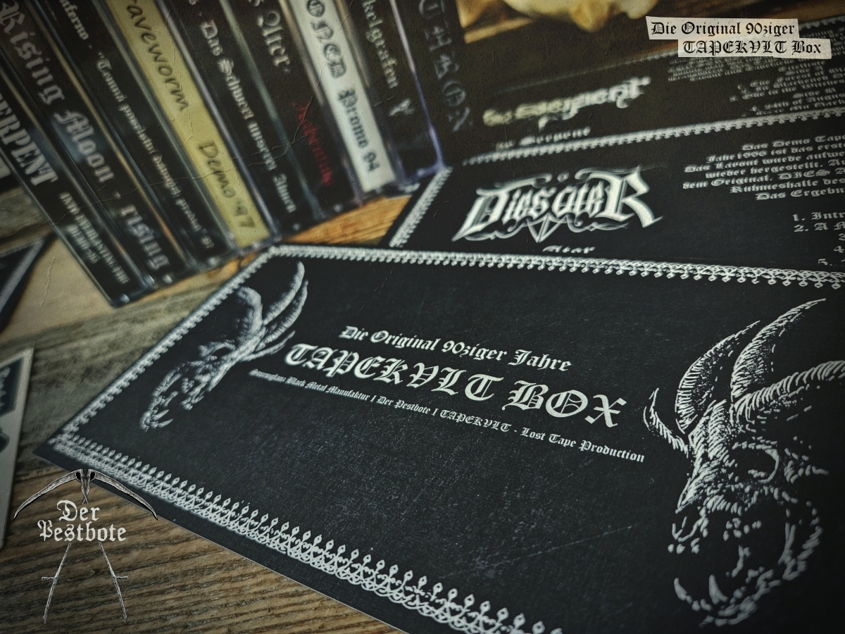 Die 90ziger Jahre sind zurück. Für die DER PESTBOTE Jubiläumsausgabe Nummer #10 gibt ein besonderes Spezial. Wir gehen zurück in die Vergangenheit und schwelgen in aufregenden und unvergesslichen Zeiten. Daher arbeiten wir an einer kleinen Tapebox mit Demos aus den 90ziger Jahren. Das Ganze ist limitiert auf 66 Stück. Wir wollen aber noch nicht so viel verraten. Es wird ein großartiges Zeitzeugnis und eine unglaubliche Reise der Erinnerungen in Zusammenarbeit mit TAPEKVLT – Lost Tapes Production. Die Tapebox wird es nur in Verbindung mit der DER PESTBOTE Ausgabe #10 geben. 33 Stück der Der Pestbote – TAPEKVLT Box Version III wird es als Verbindliche Vorbestellung (E-Mail: email@DerPestbote.de) geben und nur 33 Stück im regulären Shopverkauf.