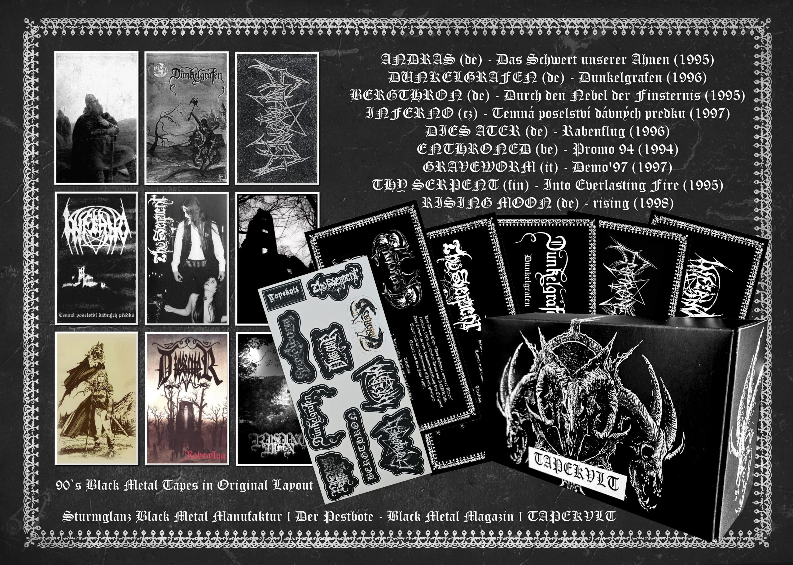 mit Compilation „In grausig kalten Winternächten“ und Plakat + „Griechisches Blut“ Box (3er DigiCD in Box mit A5 Booklet, Zertifikat und Luzifers Sigil Anhänger (limitiert auf 99 Stück). TAPEKVLT Box 9 Kult Demos aus den 90zigern Jahren im Original Layout in Sammlerbox. (limitiert auf lediglich 66 Stück).