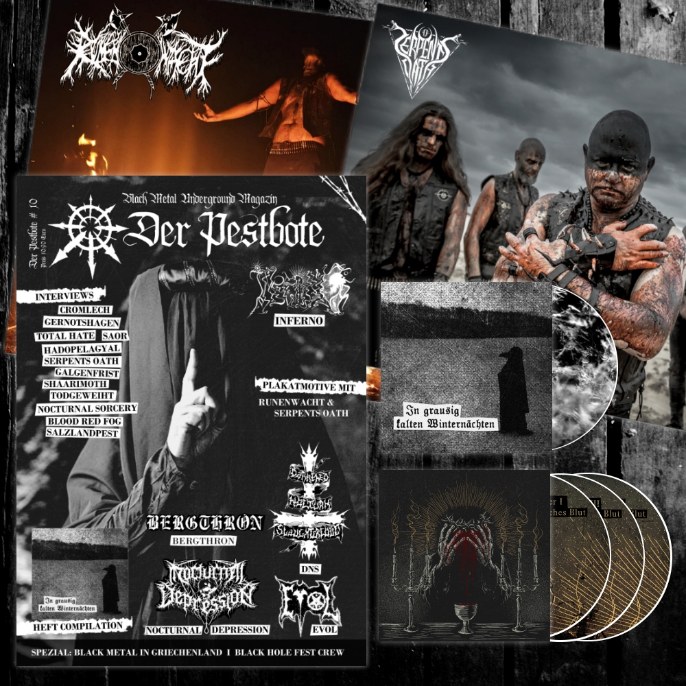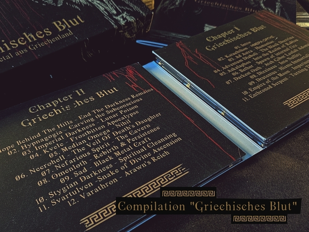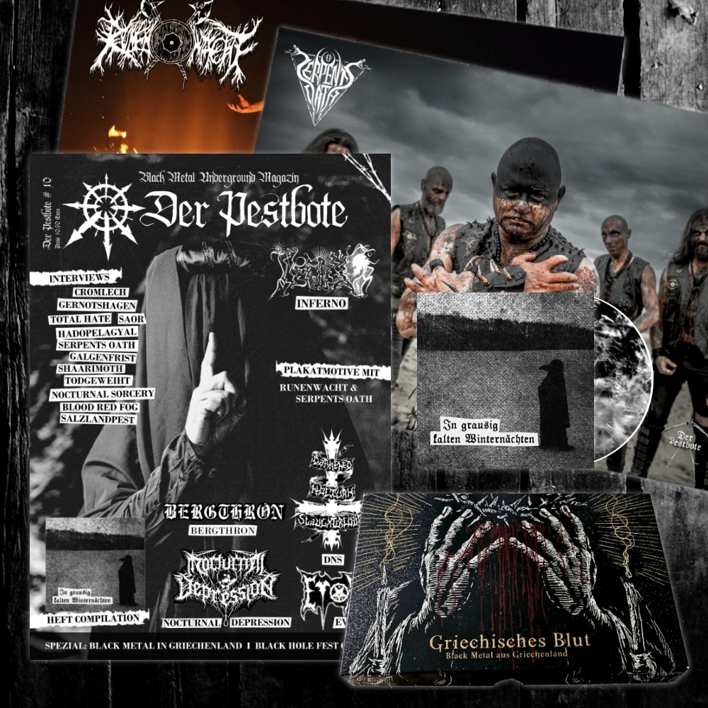 Eine Compilation mit griechischem Black Metal könnte wirklich einzigartig sein, da Griechenland eine interessante und vielfältige Musikszene hat. Die Bands haben einen ganz eigenen Stil und bringen viel Kreativität und Leidenschaft in ihre Musik ein. Diese Compilation „Griechisches Blut“ hat eine grandiose Auswahl an Bands zusammengebracht, mit sowohl klassischen als auch neueren Vertretern der Szene, um die Entwicklung und Vielfalt des griechischen Black Metal zu zeigen. Das Zeitzeugnis wird 3 CDs mit 34 Bands und einer Spielzeit von über 180 Minuten umfassen. Und natürlich, wie ihr uns kennt – solch ein Meisterwerk benötigt ein entsprechendes Layout und Format. Daher haben wir diese Box kreiert, dass dieses Machwerk präsentiert. „Griechisches Blut“ wird es nur im Zusammenhang mit der 10. DER PESTBOTE Ausgabe (Jubiläumsausgabe) geben.